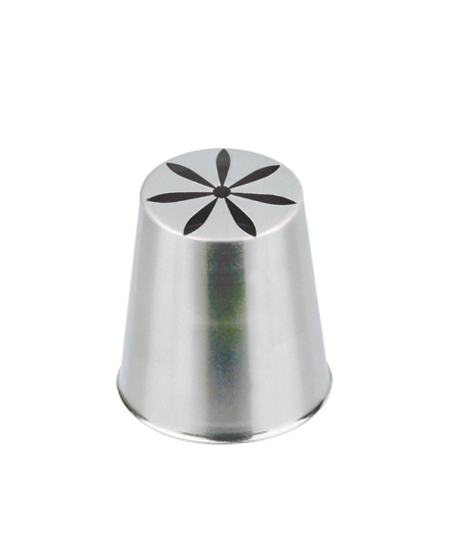 насадка имеет форму шестиконечной звезды с закрытым центром и скошенными лучами. Насадка позволяет сформировать цветок из крема одним движением. Цветок получится как настоящий, со множеством деталей.